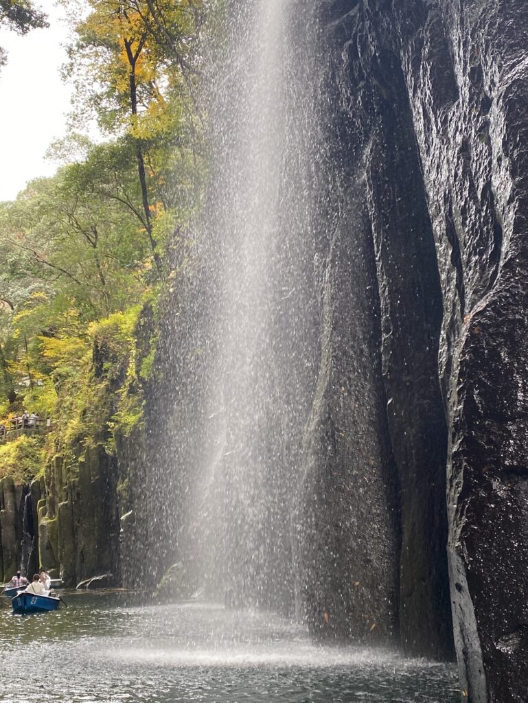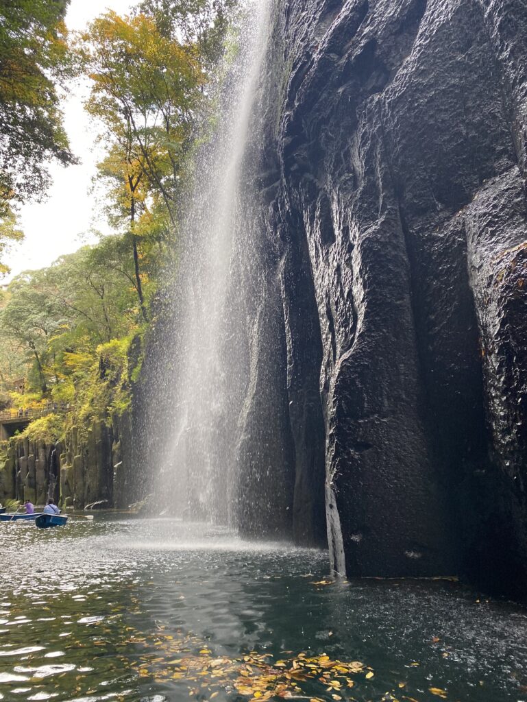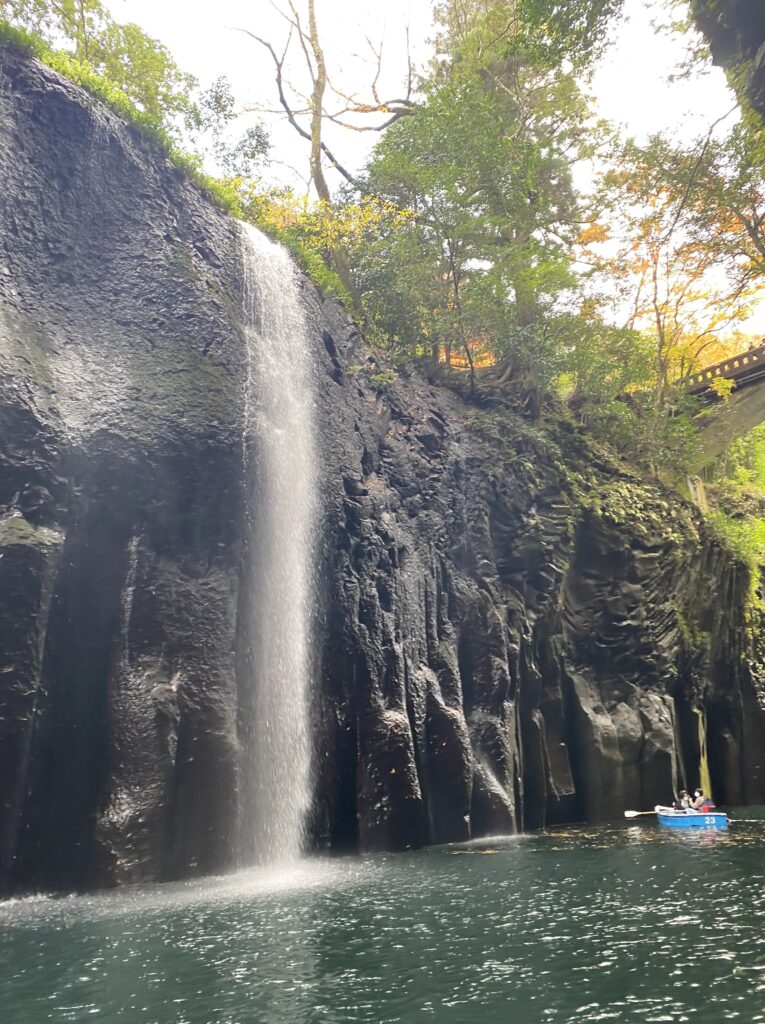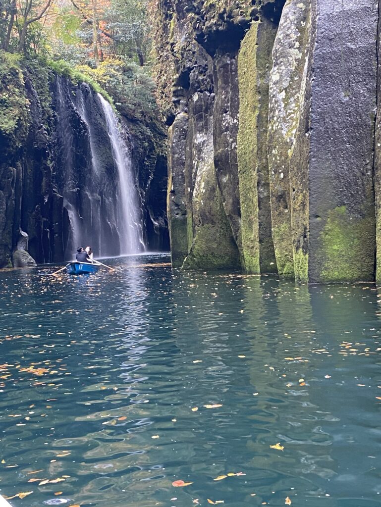 高千穂峡の真名井の滝の周辺は、貸しボートで遊覧できるようになっているので、この名瀑の至近まで近づくことができる。