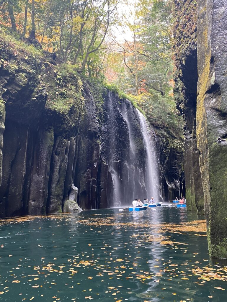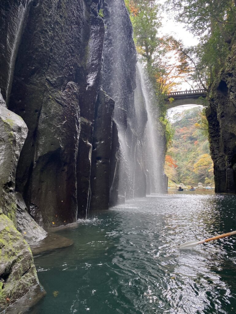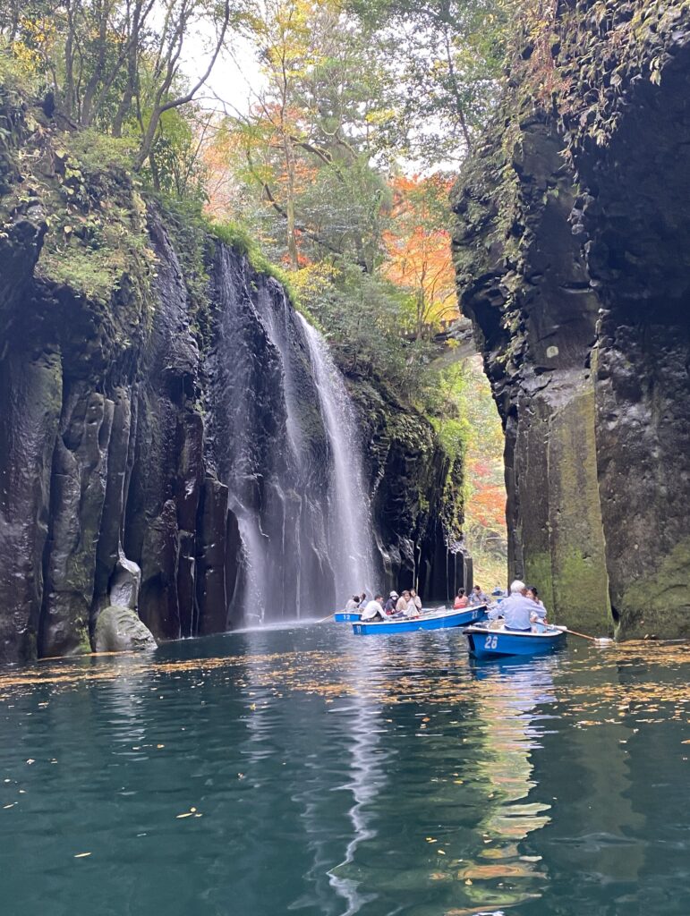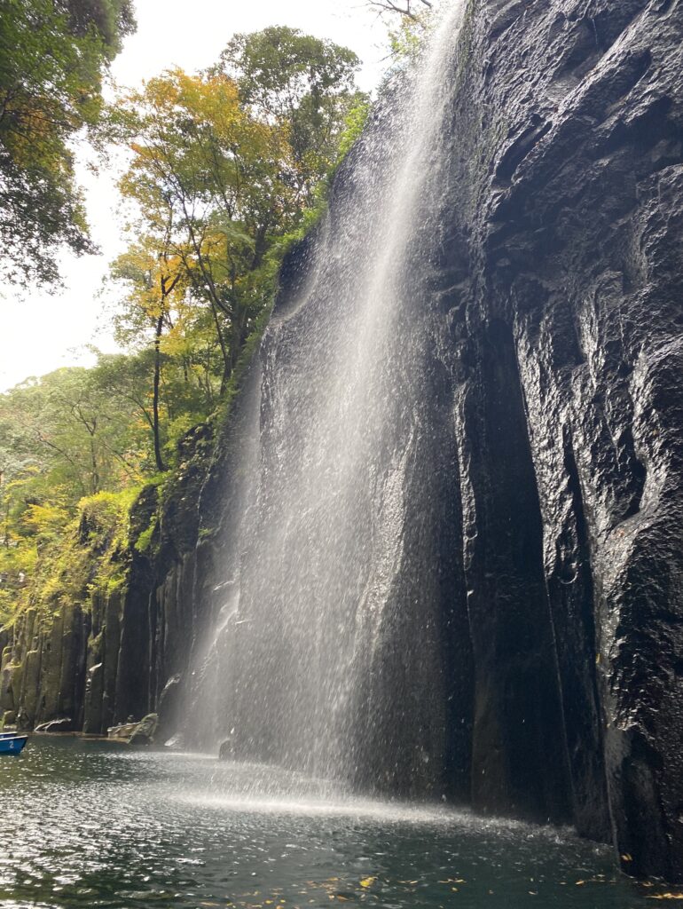 高千穂峡の真名井の滝の周辺は、貸しボートで遊覧できるようになっているので、この名瀑の至近まで近づくことができる。