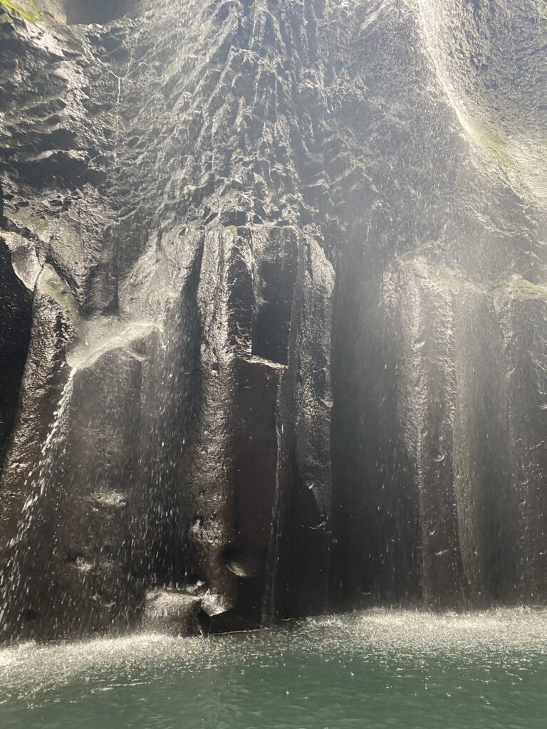両側はほぼ垂直の壁のように切り立っていて、崖上から落ちてくる滝は迫力のある眺めである。